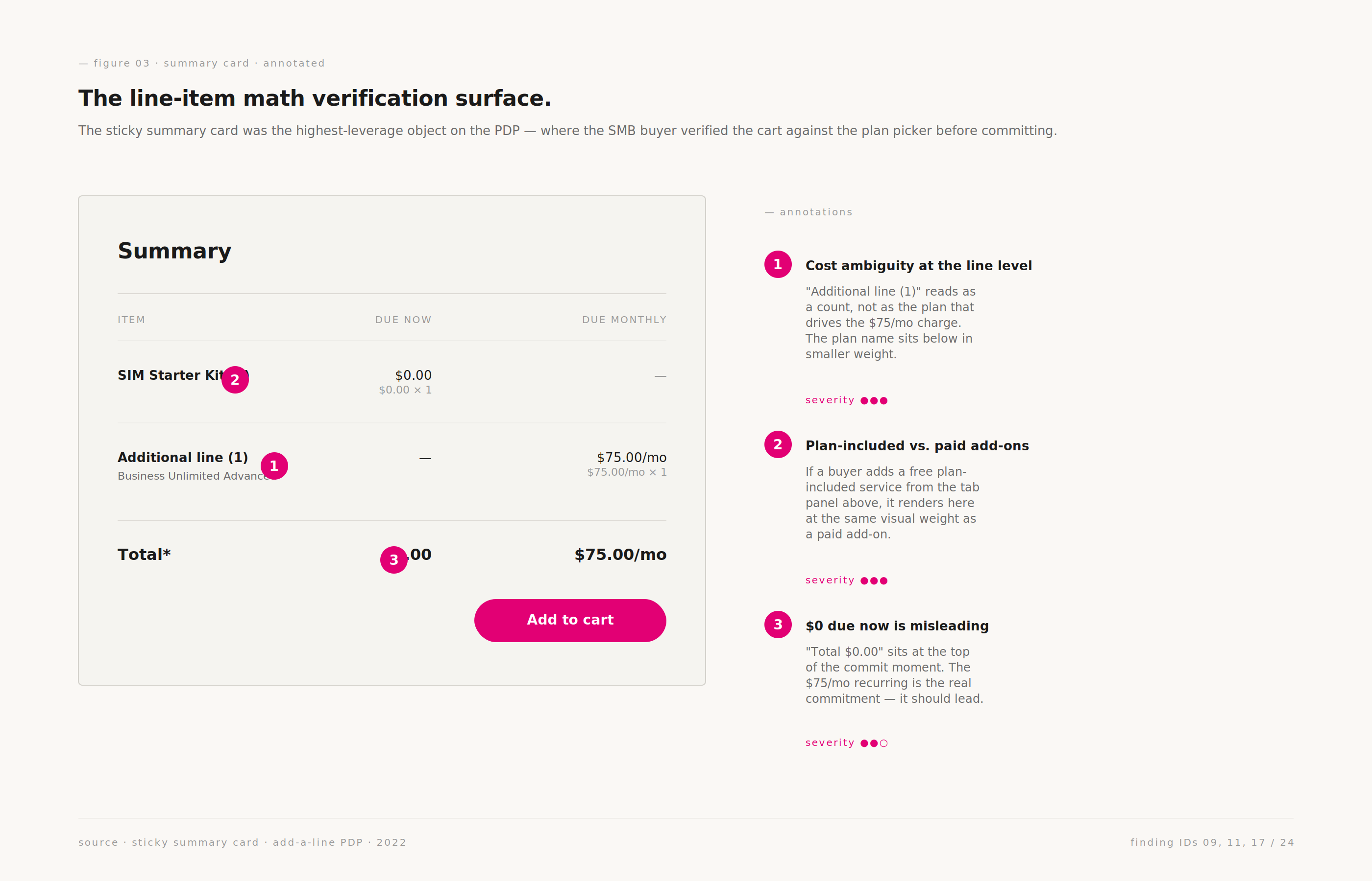 The engagement was not a redesign — it was a structured audit of an existing high-volume flow on a Fortune-100 carrier's shop. The Un-carrier's SMB segment was rapidly expanding and the Add-A-Line PDP was the load-bearing surface for that growth: every new business line a customer provisioned passed through this page, the plan picker, and the SIM-activation form.